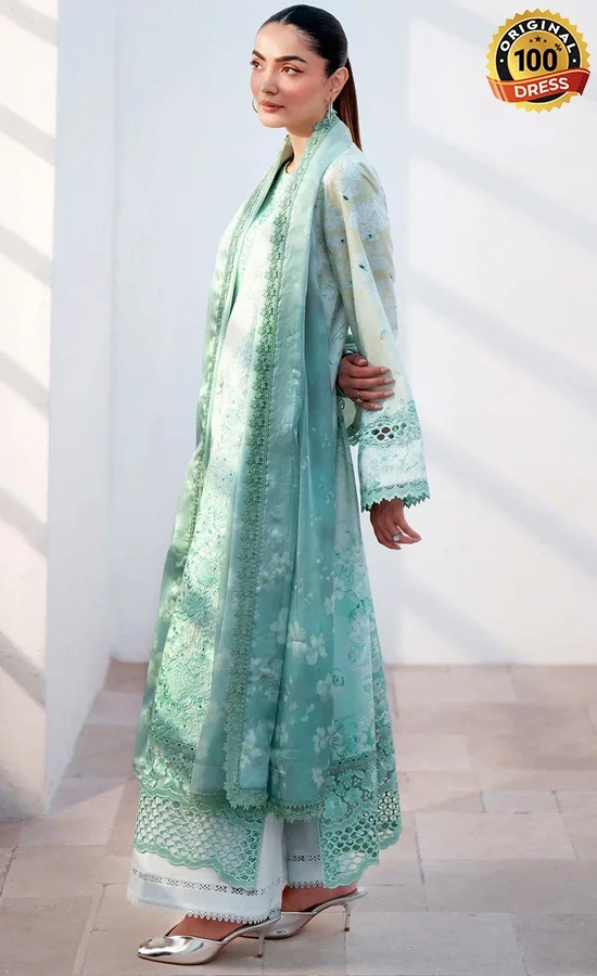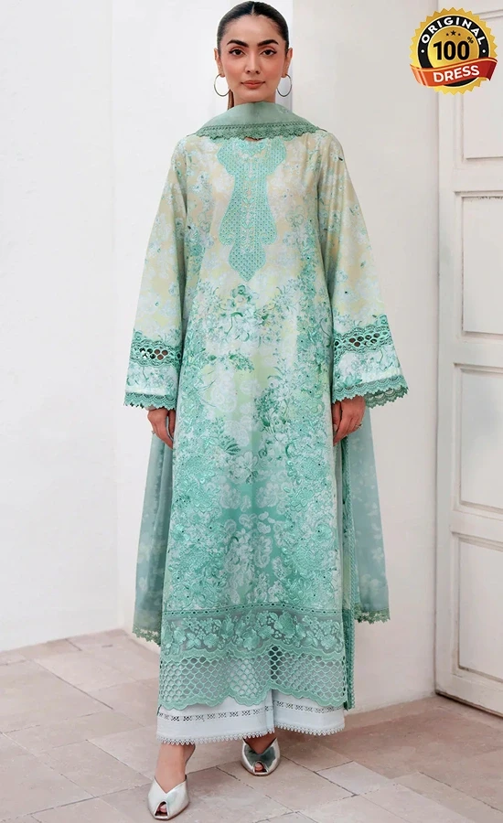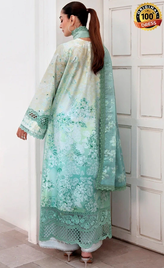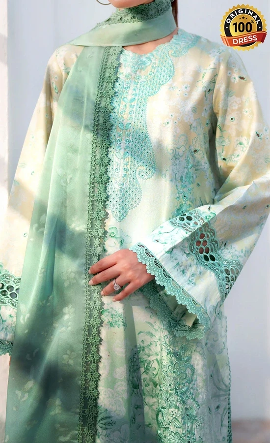 • Digital printed embroidered sleeves 2 pcs green printed lawn