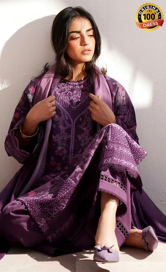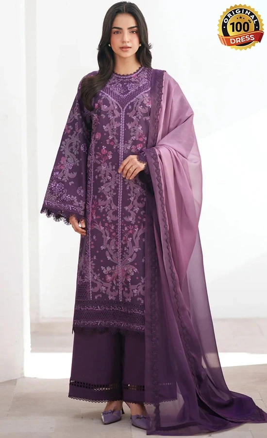 • Digital printed embroidered front 1 pc purple printed lawn